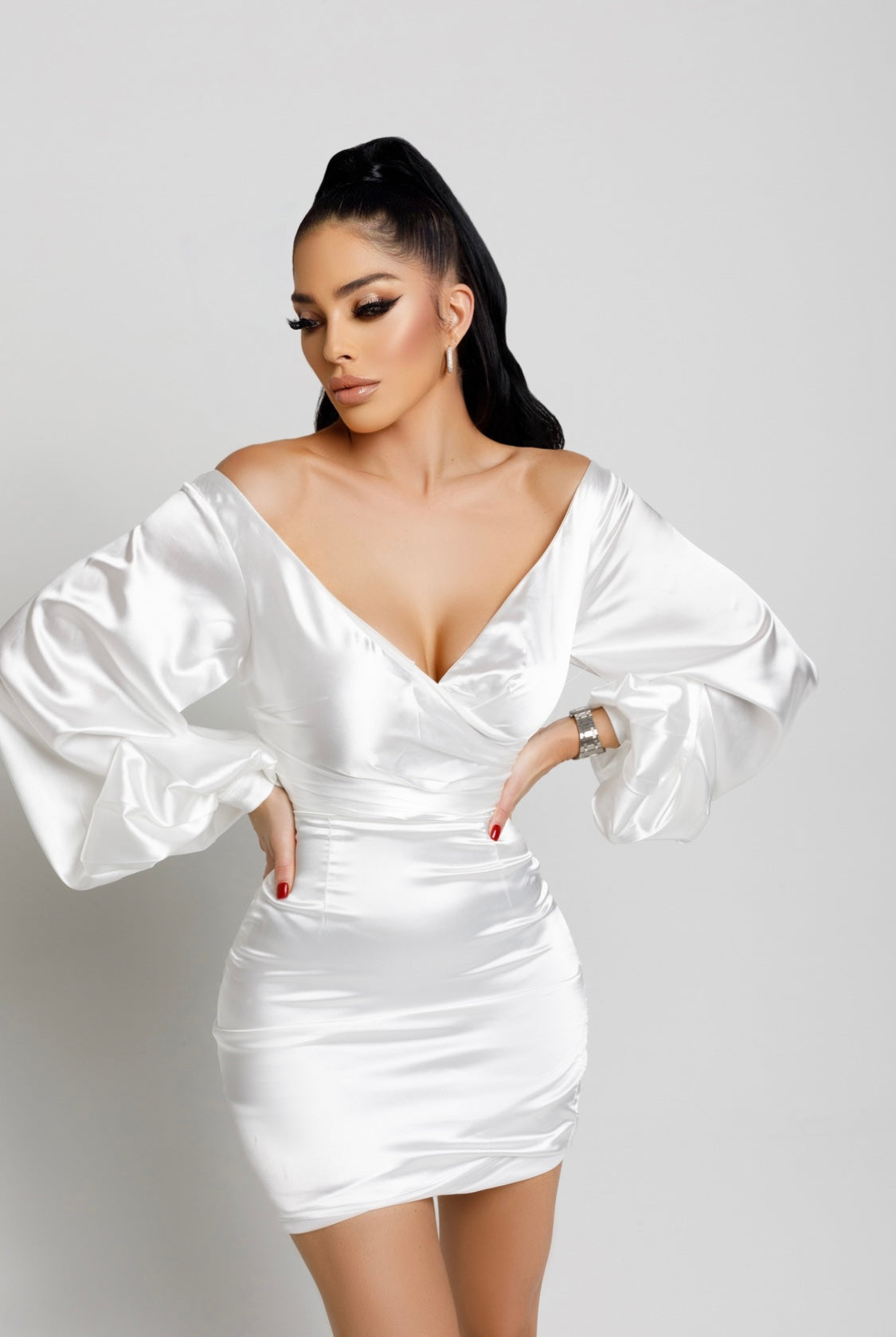 This pearl white satin long puff sleeve mini dress says it all. Made with satin material. We recommend dry cleaning.