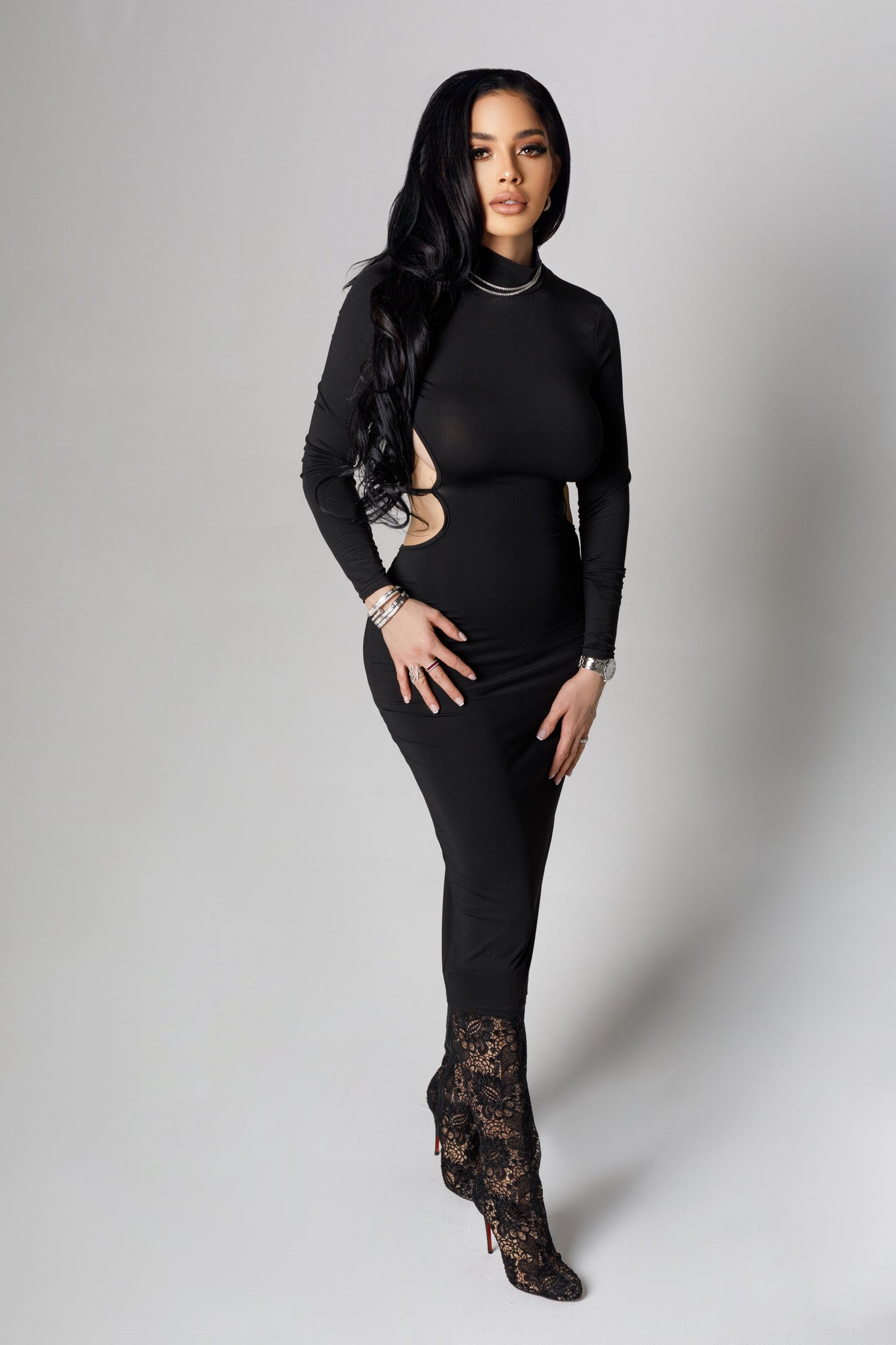 Beautifully made black long sleeve backless dress with a hint of side cut out . Made of cotton and polyester. We recommend dry cleaning.