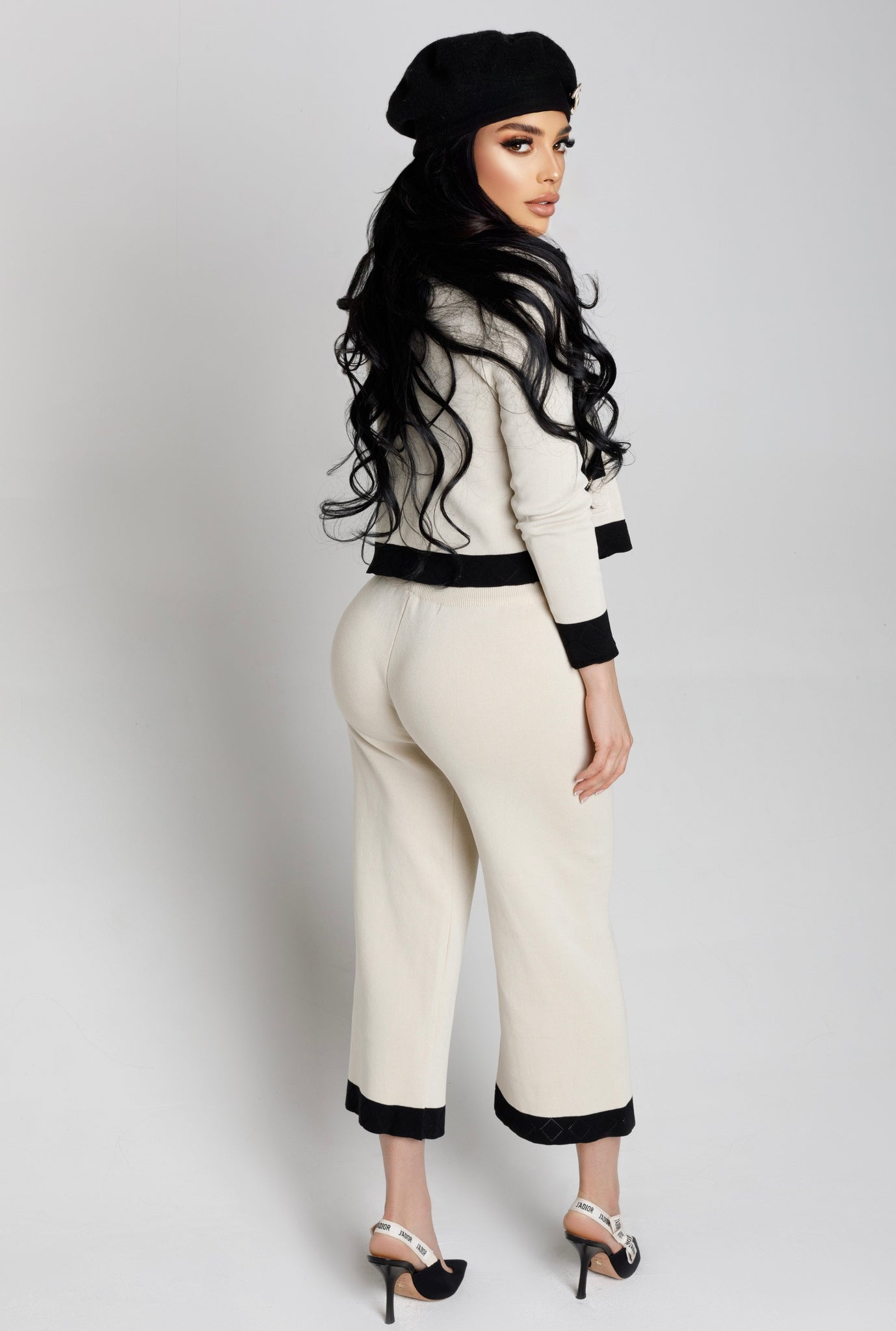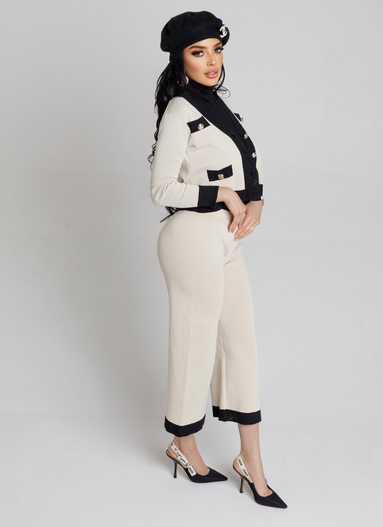 This is such an elegant knitted cardigan comes with the matching wide leg pant. Lots of stretch. Recommend dry cleaning.