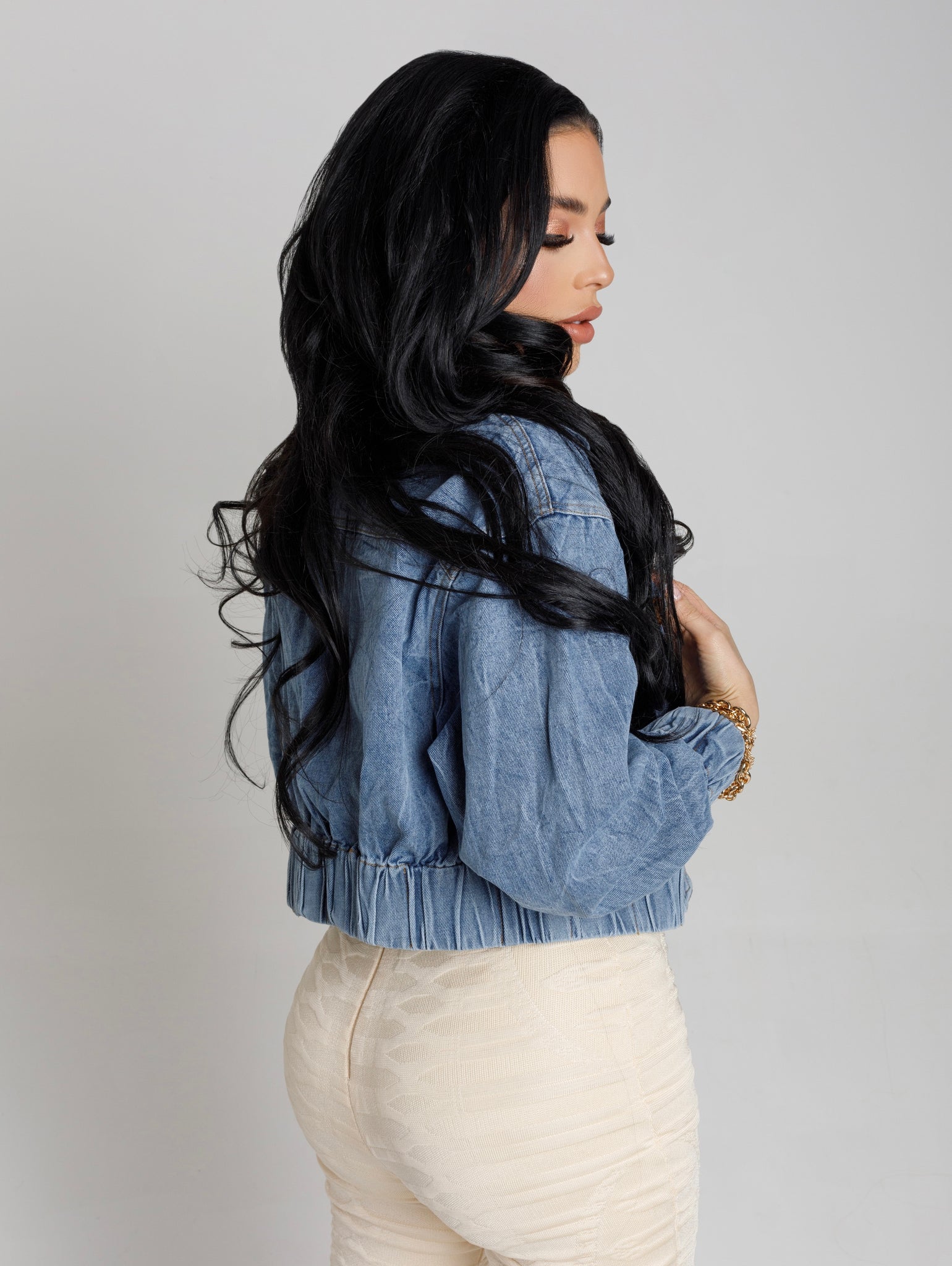 Beautiful denim washed jacket with gold embellished buttons with a lovely rouge back. We recommend dry cleaning.