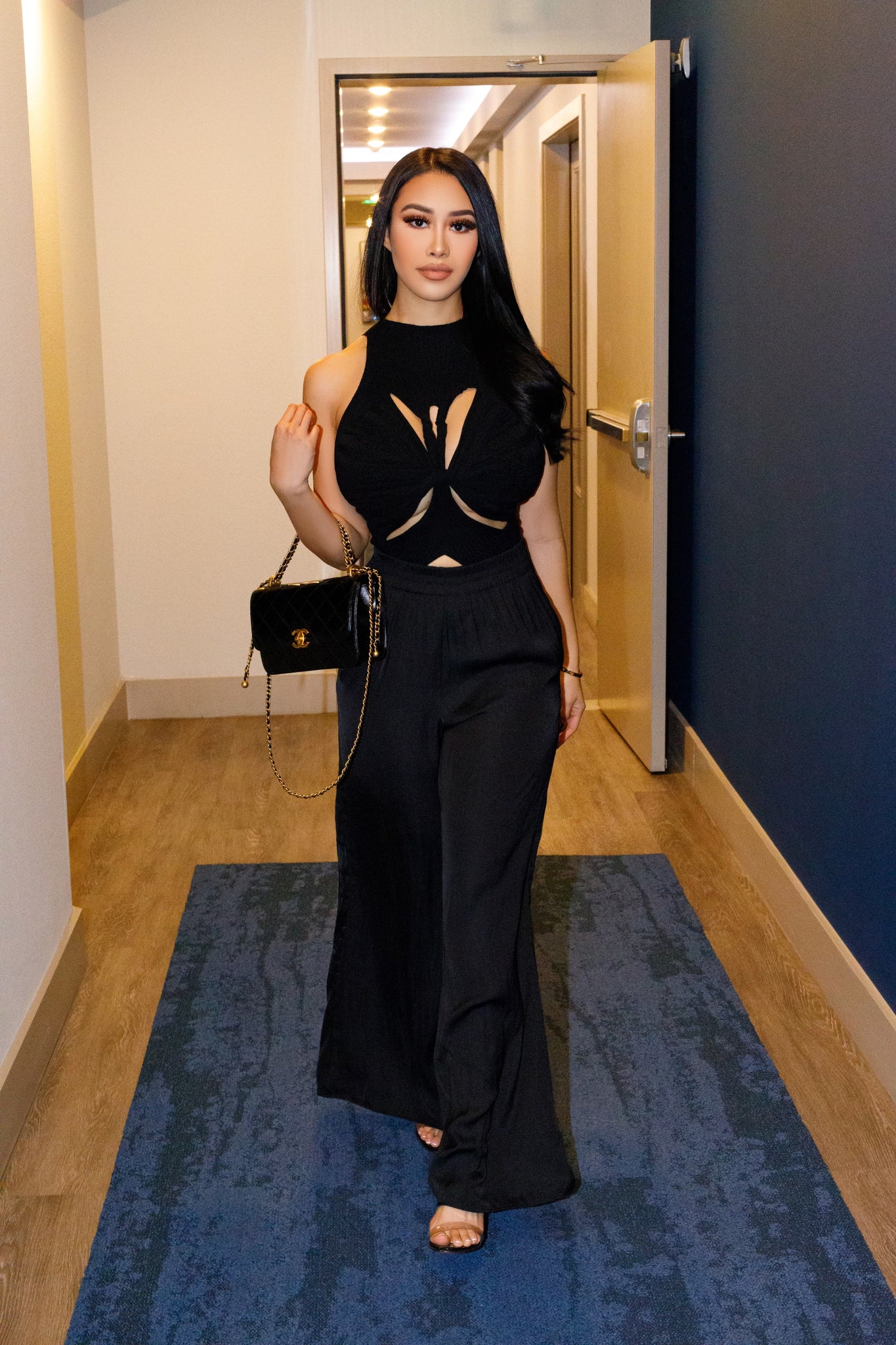 Gorgeous sleeveless ribbed cut out top made of polyester. Recommend dry cleaning.
