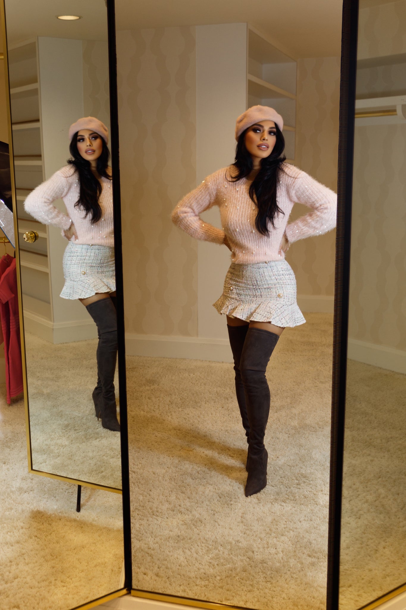This pink warm pearled knitted long sleeve is beyond perfect with the mini mermaid pearled embellished skirt. The cutest statement combo for day or night .