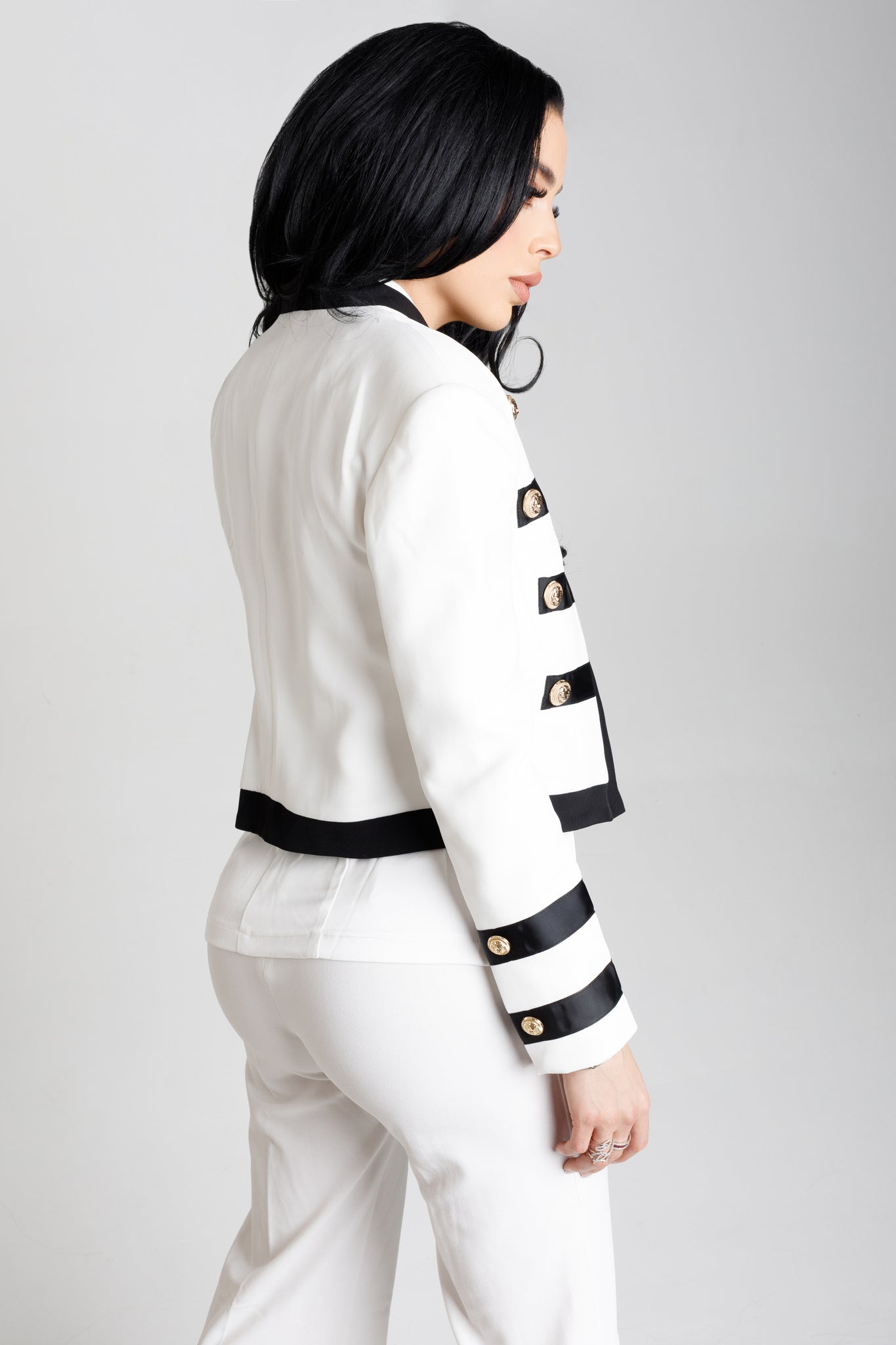 This Italian made classy collarless blazer with our signature gold button is such a statement piece for every season. We recommend dry cleaning.