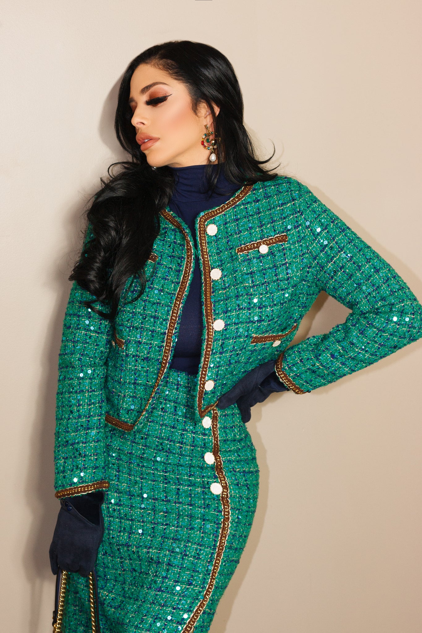 The gorgeous gold buttoned green and blue tweed & sequins set is an eye catcher, long sleeved blazer paired with a knee high slit skirt . We recommend dry cleaning.